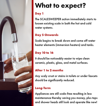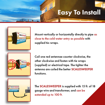 - BENEFITS OF SCALE PROTECTION: Prevents new scale formation, over time it helps break down existing scale, and because the Scalesweeper is installed where the water enters the home, virtually anything that comes into contact with water throughout the home will be protected from the effects of lime scale build-up.